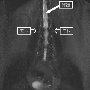 RIシンチは針で髄液内に放射性同位元素(RI:ラジオ・アイソトープ)を注入して、RIの動きや消失具合を観察する検査方法です。この際に脊髄硬膜に穴が開いていると、ちょうどしぼんだ水風船に注射器でさらに色水を加えるような状態になります。つまり、髄液内の水量が増すことによって、漏れの勢いが増します。その結果、髄液と共に放射性物質が噴水のように飛び出してくる(実際はにじみ出る)映像が撮影される事になります。